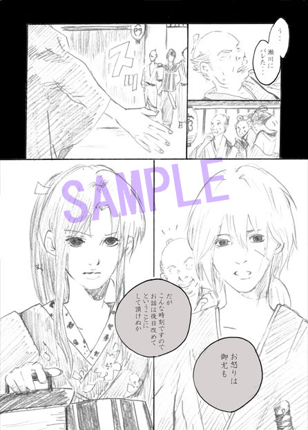 2010/10/10に開催される「ぷち浪漫譚 参」にて 『アンチ★ヒーロー』のL子様と 『うしろの正面』かたつむりの合同誌を発行しました。 <概要> タイトル:『かごめかごめ』 発行日 :2010/10/10 「ぷち浪漫譚 参」 サイズ :A5 ページ数:全60P(漫画40P/文章15p/その他5P) 価 格 :\500 ※R-16 16歳未満購入禁止 <内容> L 子 :漫画 かたつむり :文章 剣心×薫のパラレル遊女本です。 ネタ考案(つむり)→作画(L子)→続きの話し(つむり) という構成。 <通販について> ご希望の方はお手数ですが「うしろの正面」よりお申込みください。 通販分完売となりました。お申込み有難うございました。 <以下サンプルです> ![]()